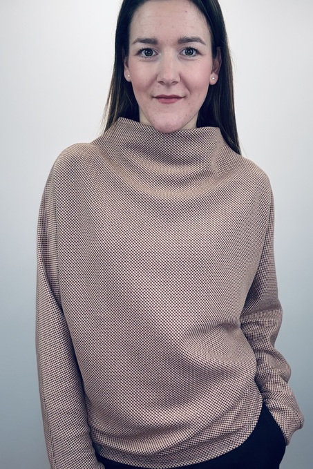 Strukturovaný elastický úplet s efektem 3D je velmi kvalitní materiál. Díky elastanu je hodně pružný a příjemný na nošení. Z rubové strany je materiál hladký a dobře se obléká.