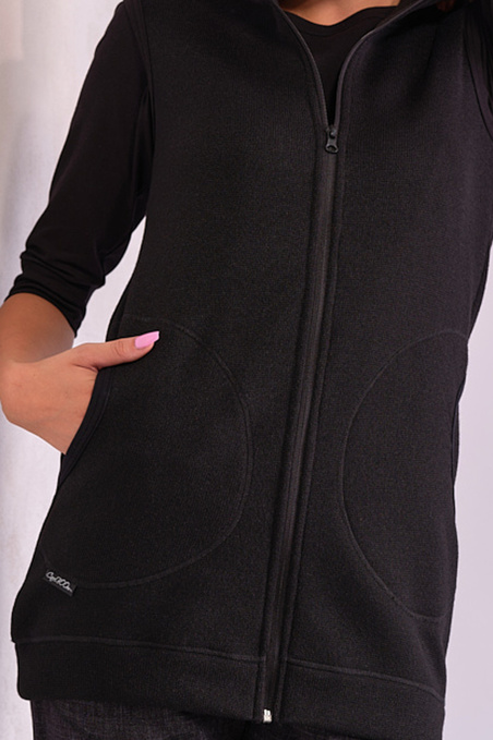 Vesta dlouhá svetrová s límcem a dvěma našitými kapsami, střih mírně projmutý, dole do nápletu.