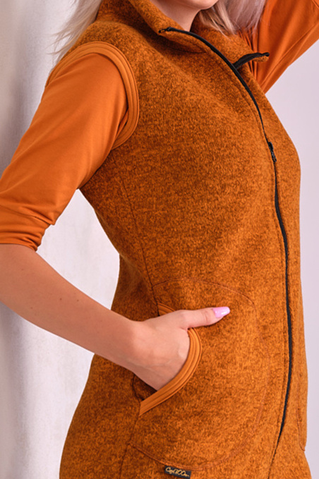 Vesta dlouhá svetrová s límcem a dvěma našitými kapsami, střih mírně projmutý, dole do nápletu.